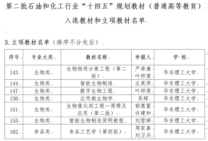 日前,第二批石油和化工行业“十四五”规划教材(普通高等教育)入选教材和立项教材名单公布,全校各类入选教材共21项,350vip8888新葡的京集团7项教材榜上有名。其中,生物类6项,食品类1项。